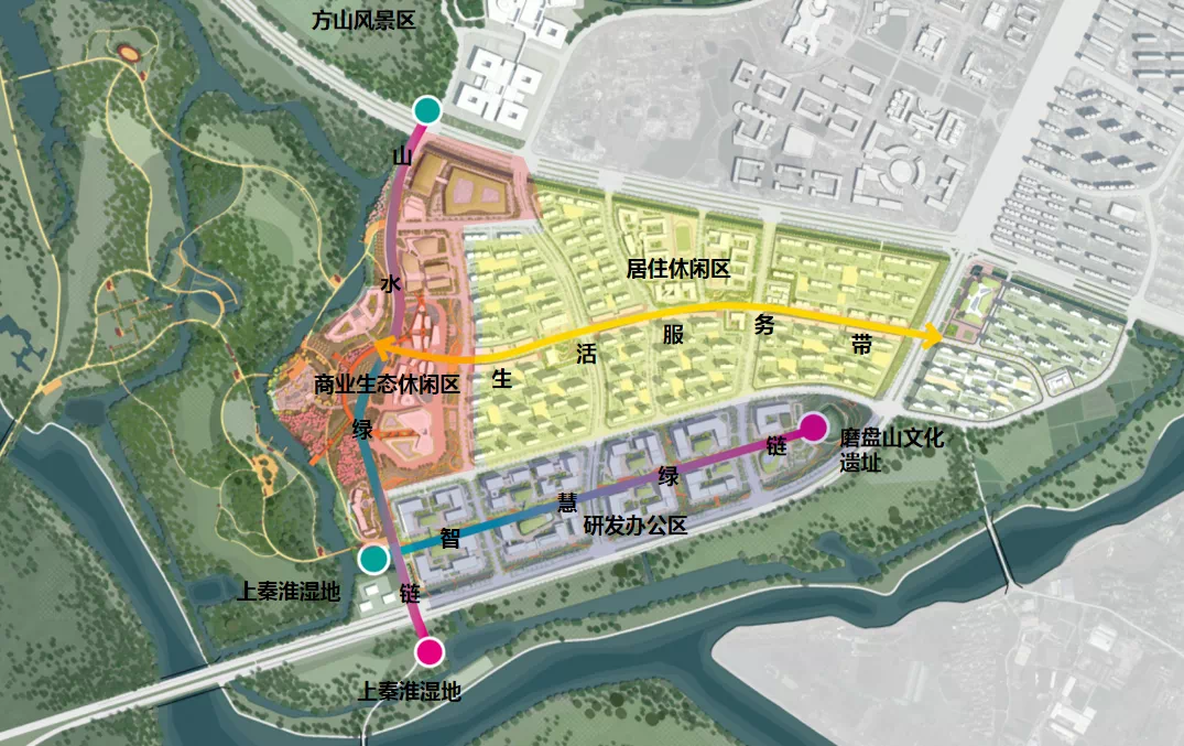 02两链山水绿链,连接方山与上秦淮湿地。智慧绿链 ,连接磨盘山文化遗址与上秦淮湿地。 03三区