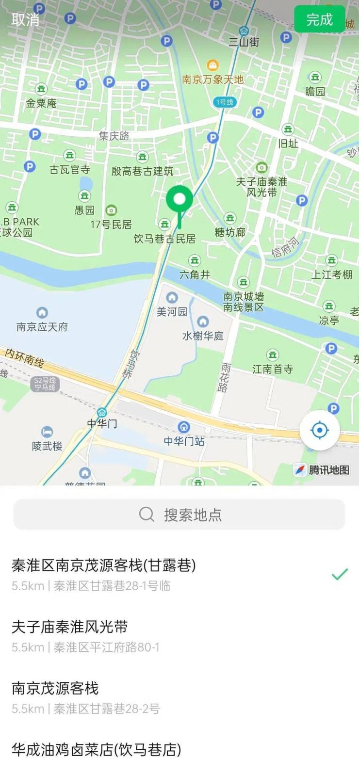 2.点击地图任意位置,搜索地点或直接选择系统提供的地点信息,点击“完成”,即可显示该地点周边所有采样点。