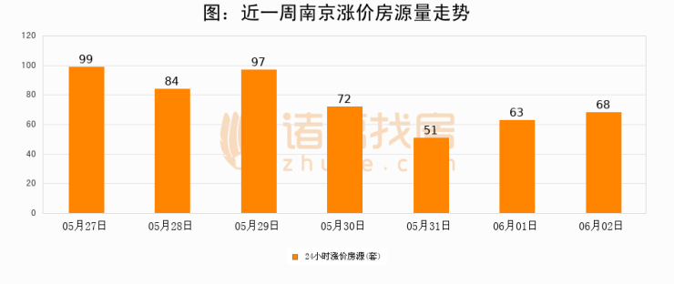 根据诸葛找房数据显示,南京24小时涨价房源量为68套,较06月01日增加5套,环比上涨7.9%。与此同时,涨价房源占比小幅扩大,业主信心有所提升。