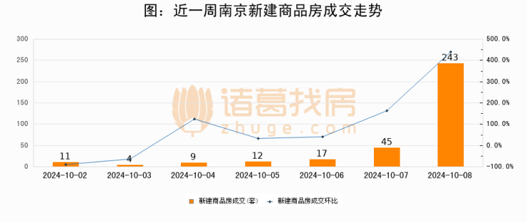 根据南京市住房保障和房产局数据显示,2024年10月08日南京新建商品房成交243套,较昨日增加198套,环比上涨440%