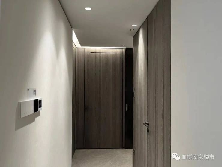 还有一处比较特别的就是卧室廊道的设计,从我拍照的角度看过去只能看到两扇通顶门,左侧用大面积白色墙布“隐形了”南向卧室门,竹林灰的鸡翅木木饰面与白色墙布巧妙的空间组合,使得空间延展性更好,不会觉得压抑局促。