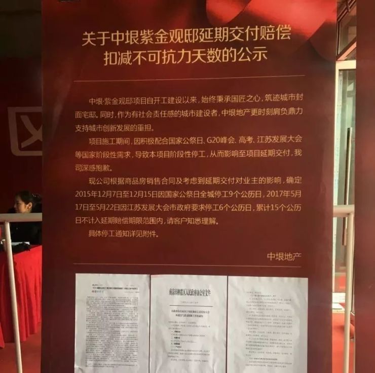 根据现场公示来看,中垠紫金观邸因积极配合G20峰会、高考、江苏发展大会等国家阶段性需求,导致该项目阶段性停工,从而影响至项目延期交付。
