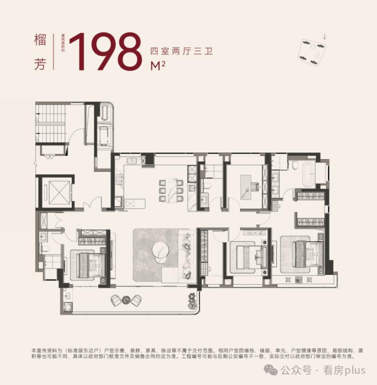 先来看看户型,198㎡整体是四房两厅三卫的设计,层高约3.15米,南向六开间,约20米南向整体面宽。客厅横厅尺度达到了约6.2米,整体建面约53㎡的LDK一体化空间。双联阳台面宽约9.35米,进深约1.8米。