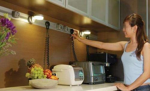 嵌入式轨道插座,也就是把轨道和墙面一体化,非常的适合厨房这类使用电器较多的功能区,不用担心插座不够多,也不用担心电线不够长,可以灵活用电。