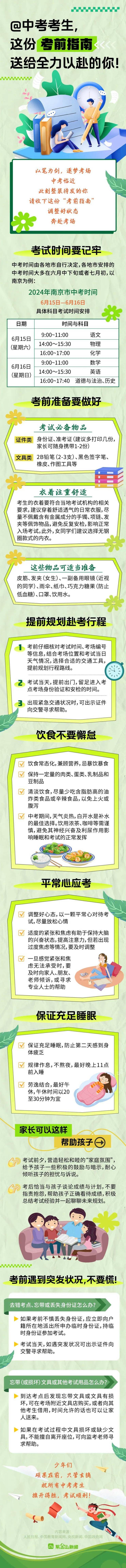 6月13日,2024年《南京市中考指南》新鲜出炉。今年我市初中毕业生约6.6万人,其中原市区4.0万人。预计全市初中毕业生升学率可达99%以上。中考考生这份“考前指南”送给全力以赴的你…