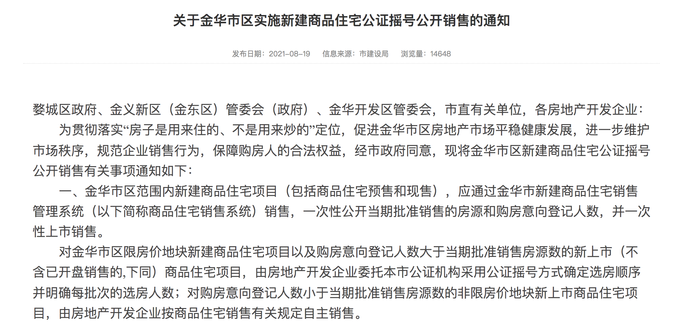 浙江省金华市区新建商品住宅实行公证摇号的细则落地。为进一步维护市场秩序,规范企业销售行为,保障购房人的合法权益,8月19日,金华市住房和城乡建设局发布《关于金华市区实施新建商品住宅公证摇号公开销售的通知》。