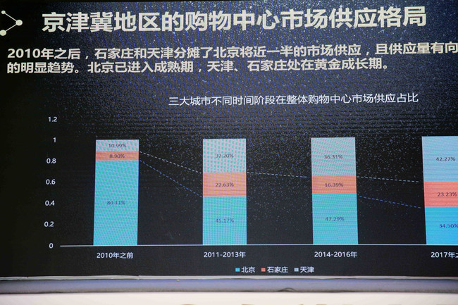 上述报告显示,京津冀地区购物中心存量区域呈现明显的单极化特。2010年之前,京津冀地区商业中心有80%在北京,天津和石家庄占比20%。而近期天津和石家庄分摊了北京50%的供应,并且有向天津和石家庄倾斜的趋势。