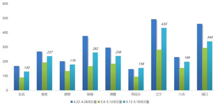 从区域情况看,上周江宁成交433套,独自领跑全市,浦口排名第二位,成交量340套;鼓楼、栖霞、秦淮同属第三梯队,成交量在230-270套。环比来看,各区成交量均有所上涨,其中雨花台、鼓楼、江宁涨幅更高,均超过了50%。