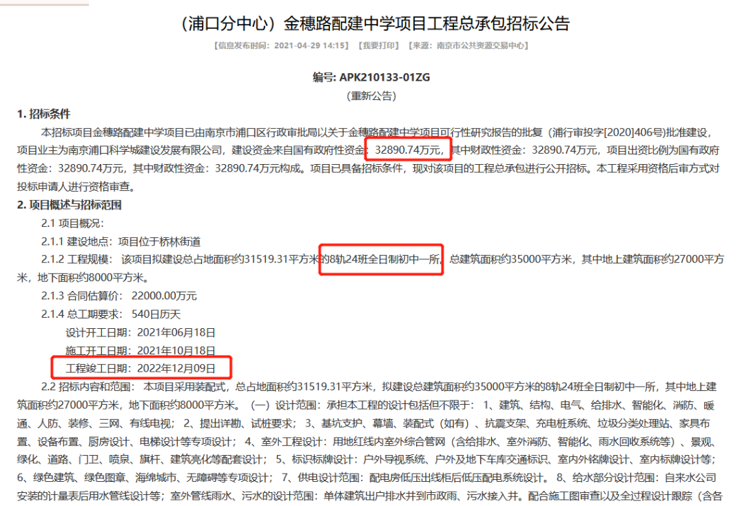 今年4月,公共资源网上发布了一条《金穗路配建中学项目工程总承包招标公告》,公告文件信息显示,金穗路配建中学项目工可已经批复,总投资约32890.74万。