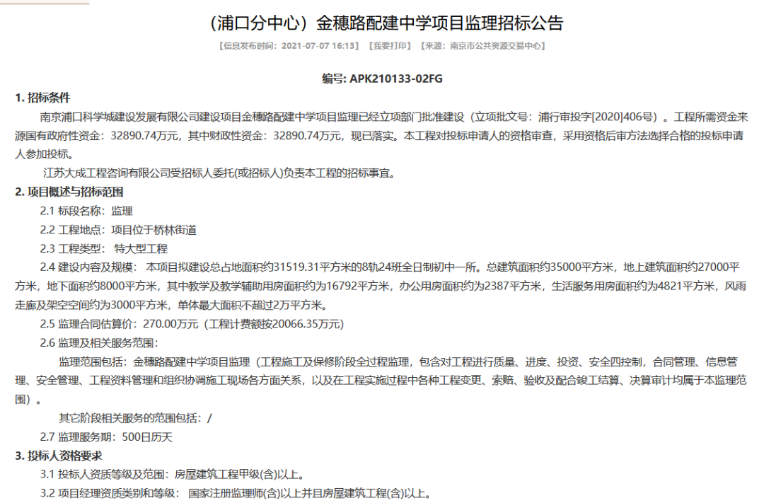 好消息,南京再添一所公办名校! 桥林科学城片区排名前列所公办配建中学又迎新进展,近日,金穗路配建中学项目监理招标公告正式发布,监理服务期500日历天。 今年4月,公共资源网上发布了一条《金穗路配建中学项目工程总承包招标公告》,公告文件信息显示,金穗路配建中学项目工可已经批复,总投资约32890.74万。