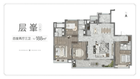 今天该户型样板间已经公开。建面约188㎡户型处于我们小区最核心位置,也是所谓的楼王位置,整栋楼视线一览无余,视野开阔,在户型设计上,我们做了四房两厅三卫,双套房设计,朝南面宽达到17m,并且拥有9.3m的阔绰阳台。