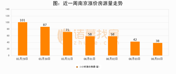 根据诸葛找房数据显示,南京24小时涨价房源量为38套,较06月03日减少4套,环比下降9.5%。与此同时,涨价房源占比小幅回落,对于购房者来说是一个入市窗口期,购房者可抓住时机入市。