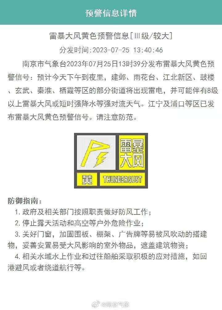 南京市气象台2023年07月25日13时39分发布雷暴大风黄色预警信号:预计今天下午到夜里,建邺、雨花台、江北新区、鼓楼、玄武、秦淮、栖霞等区的部分街道将出现雷电,并可能伴有8级以上雷暴大风或短时强降水等强对流天气。江宁及浦口等区已发布雷暴大风黄色预警信号。请注意防范。