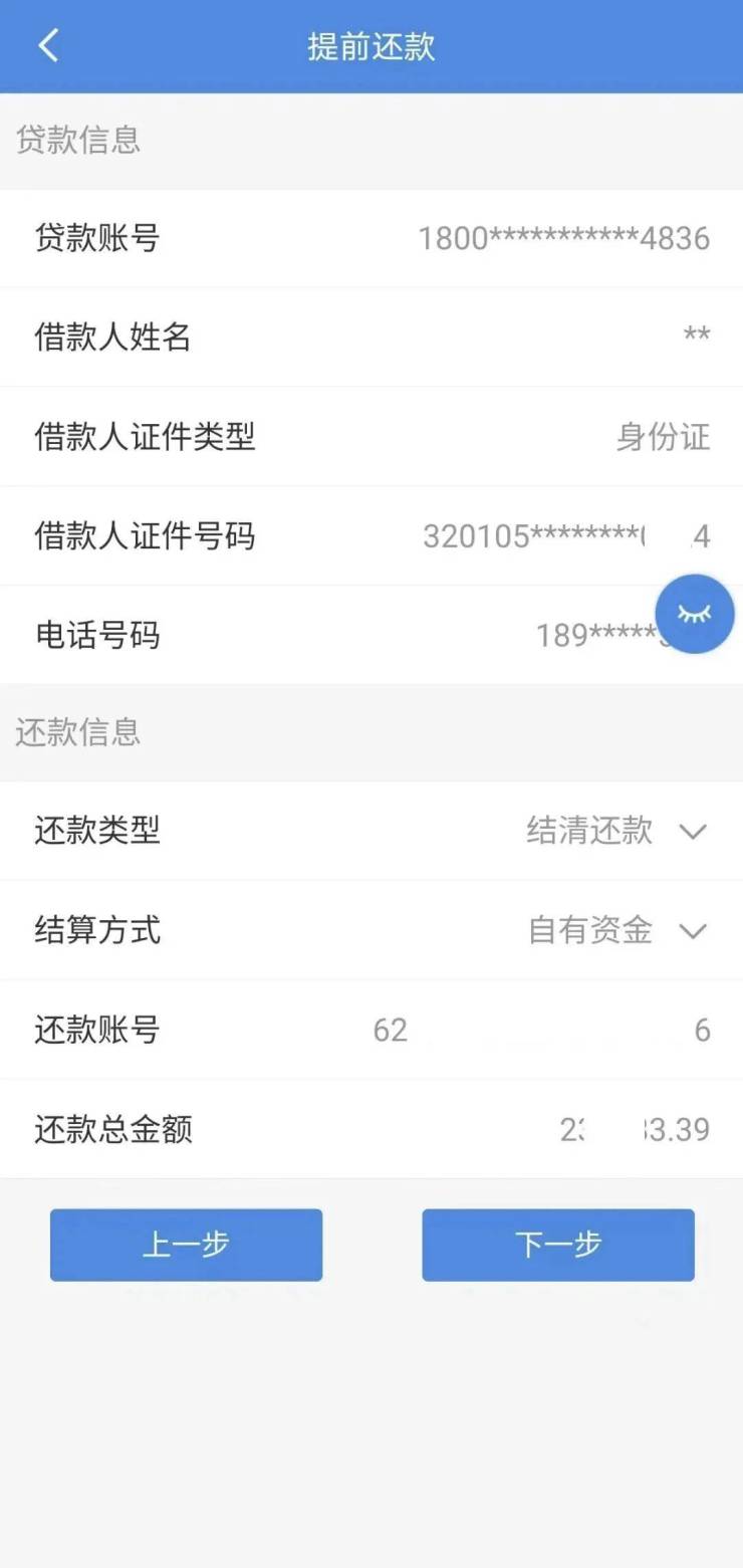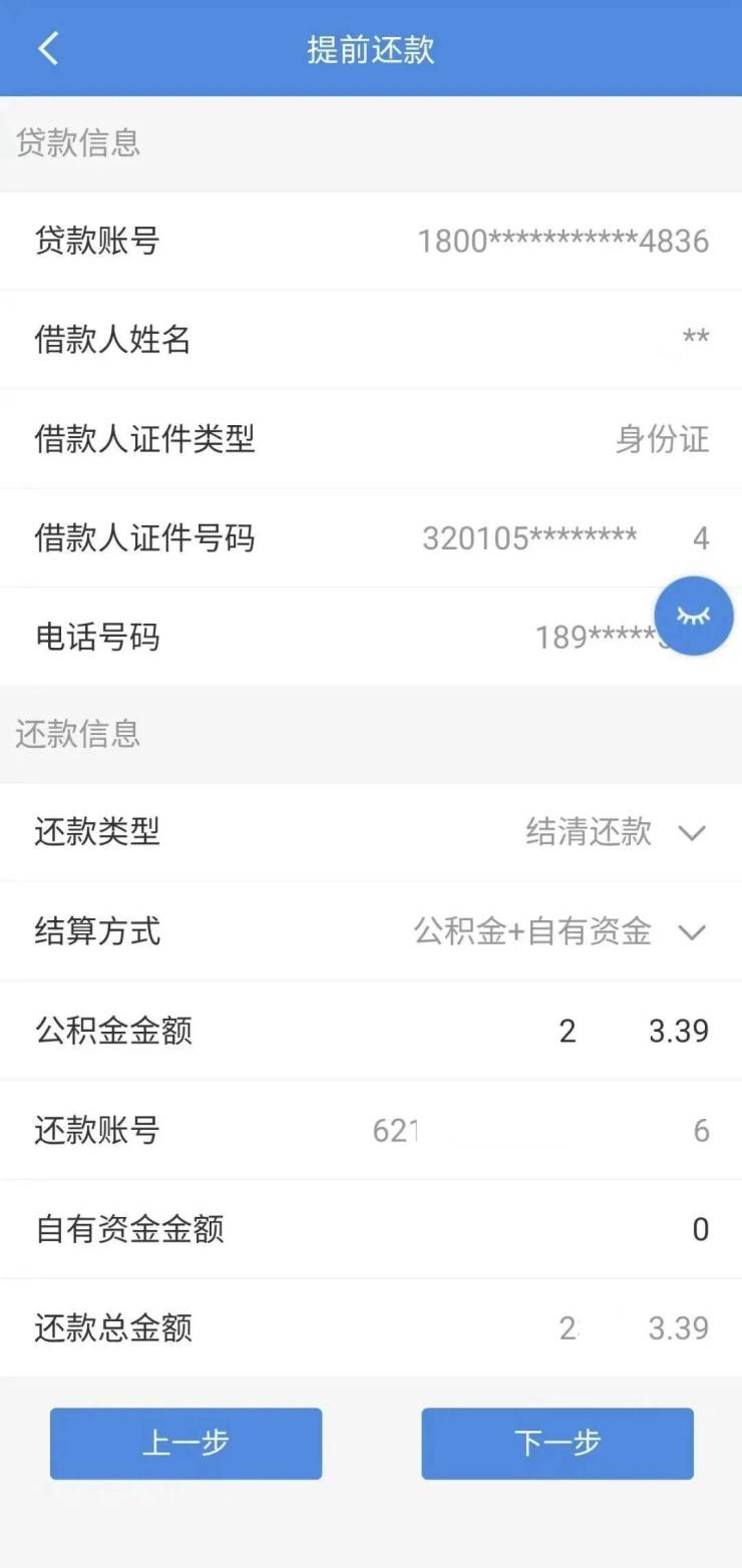 5、若您还款类型选择【结清还款】,接下来您需要选择结算方式,如果您选择【公积金】结算,确认还款信息无误后,可点击【下一步】;如果您选择【自有资金】结算,需要确认还款账号是否正确并确认还款信息无误后,可点击【下一步】;如果您选择【公积金+自有资金】结算,您需要手动输入公积金金额,自有资金金额自动计算。确认还款账号是否正确并确认还款信息无误后,可点击【下一步】。