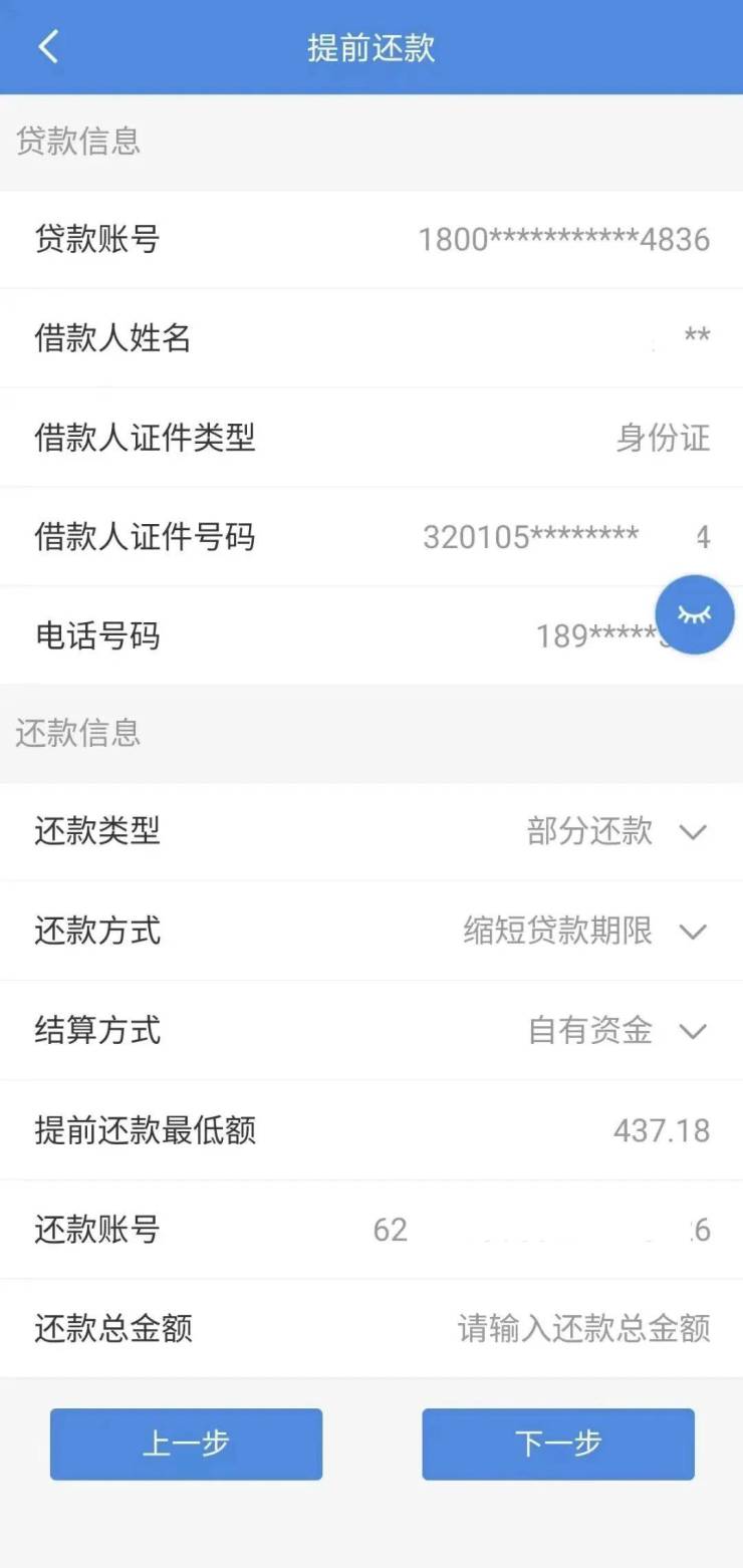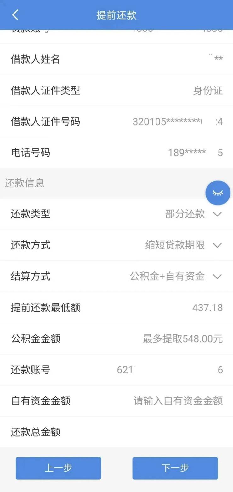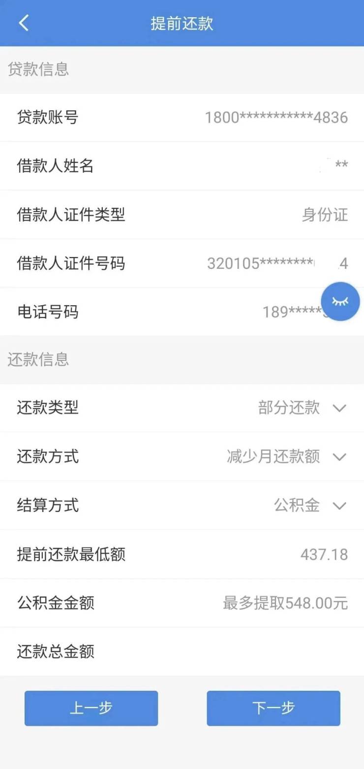 4、若您还款类型选择【部分还款】,您需要先选择还款方式:【减少月还款额】或者【缩短贷款期限】,然后选择结算方式,如果您选择【公积金】结算,在公积金金额栏输入提前还款金额,确认还款信息无误后,可点击【下一步】;如果您选择【自有资金】结算,需要确认还款账号是否正确,然后在还款总金额栏输入提前还款金额,确认还款信息无误后,可点击【下一步】;如果您选择【公积金+自有资金】结算,您需要在公积金金额栏和自有资金金额栏分别输入提前还款金额,还款总金额自动计算。确认还款账号是否正确并确认还款信息无误后,可点击【下一步】。