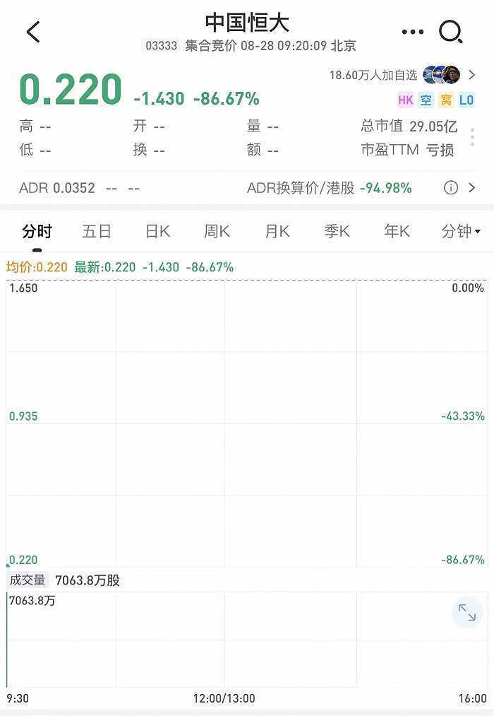 8月28日开盘后,中国恒大在复牌首日股价大跌,下跌幅度达到86.67%,报0.22港元/股,总市值仅剩约29.05亿港元。