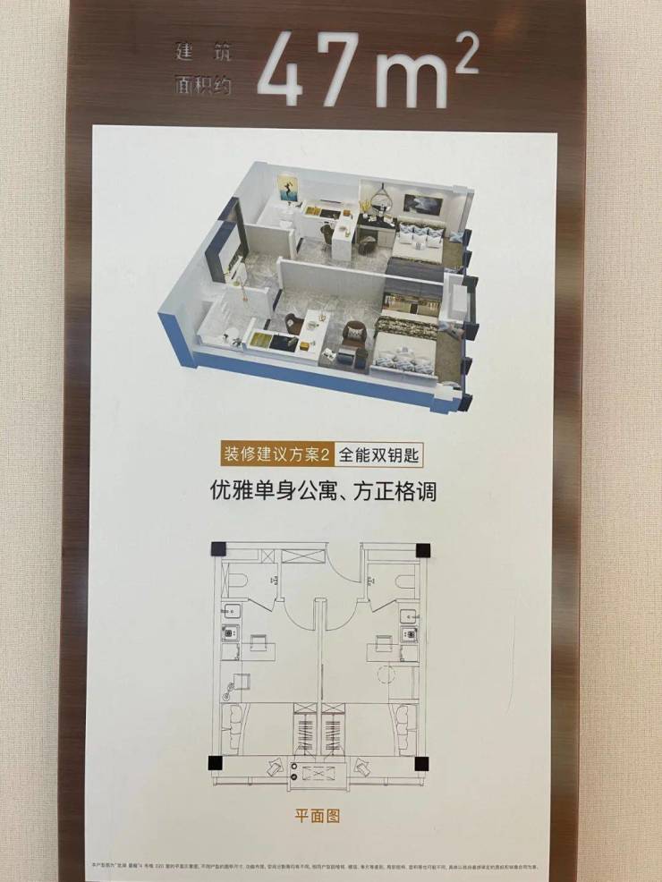 龙湖天曜星座的面积段均为47平米,开发商针对该户型定制了2种装修方案供买房人参考,分别为一室一厅设计、双钥匙设计。