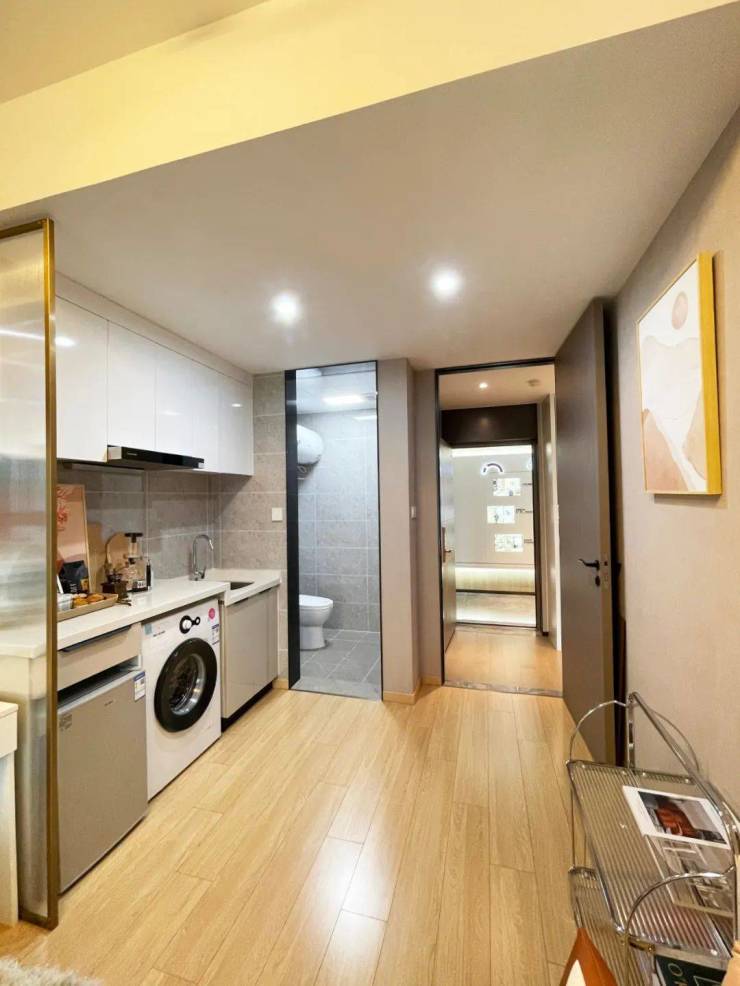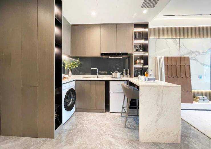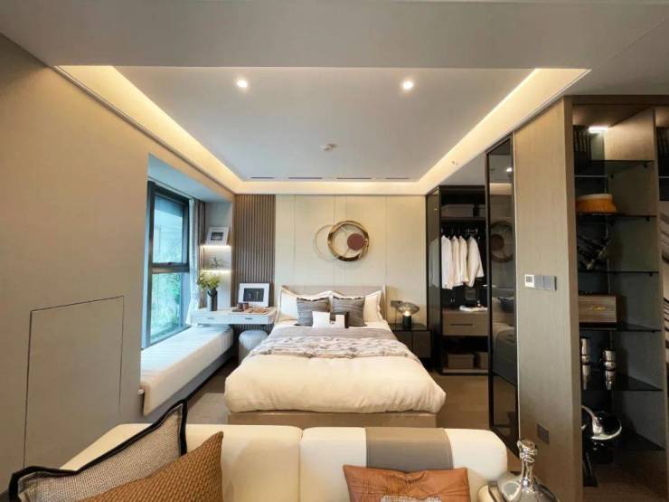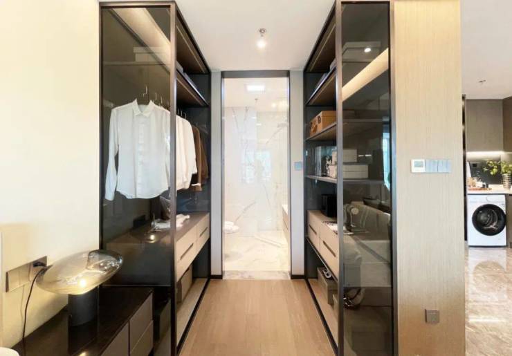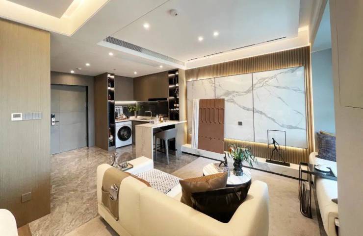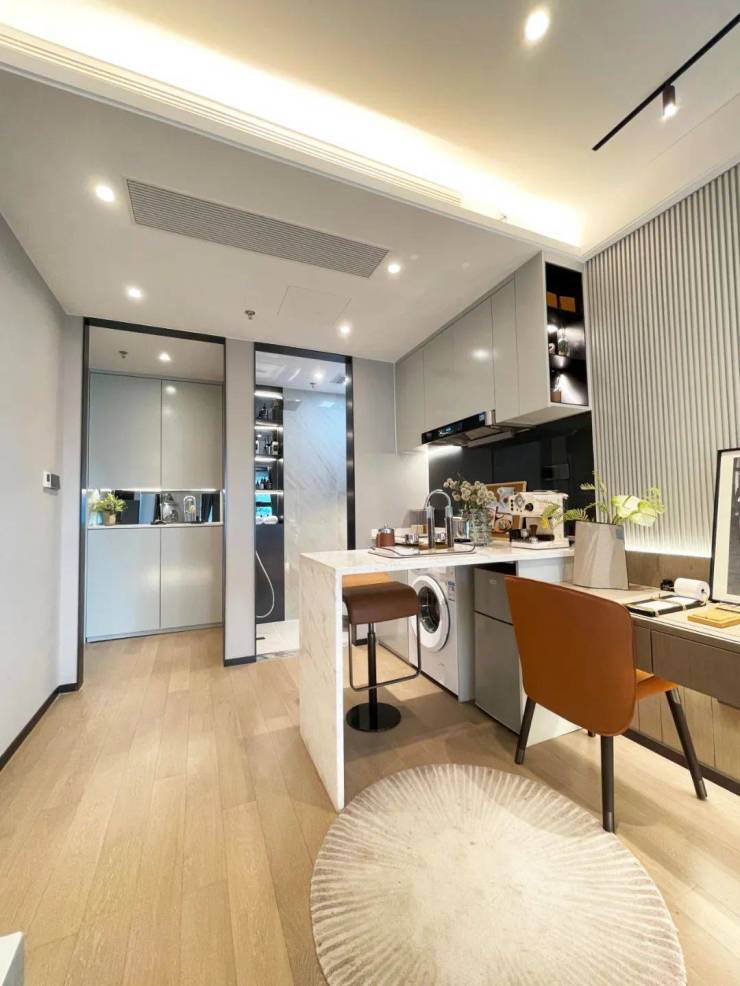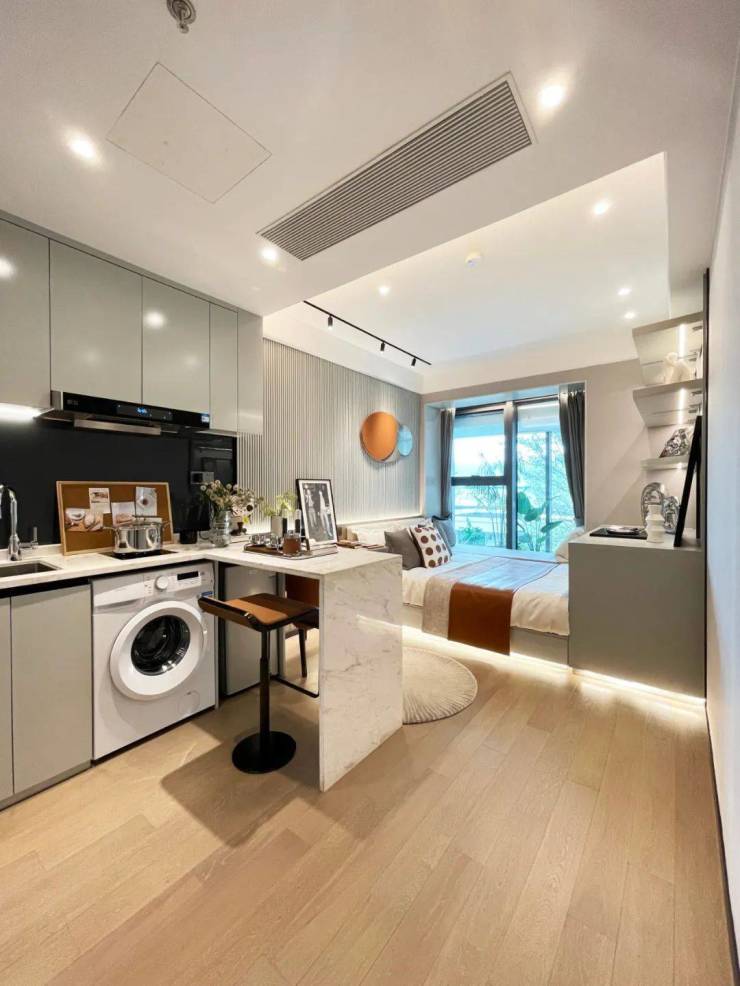 一室一厅设计更适合单身自住客群,客厅、厨房、卧室、衣帽间、卫生间等功能区全部具备,比起去租住宅的单间,私密性更强,功能区更多。