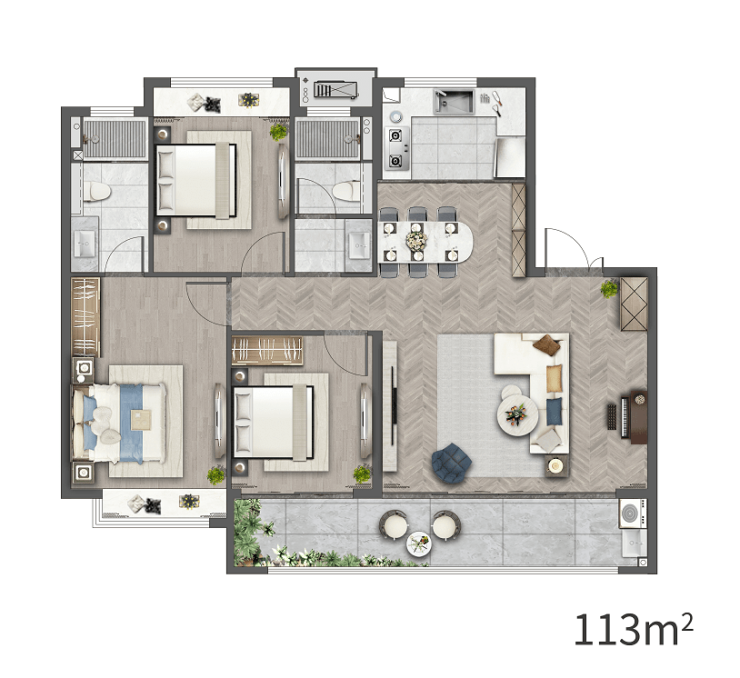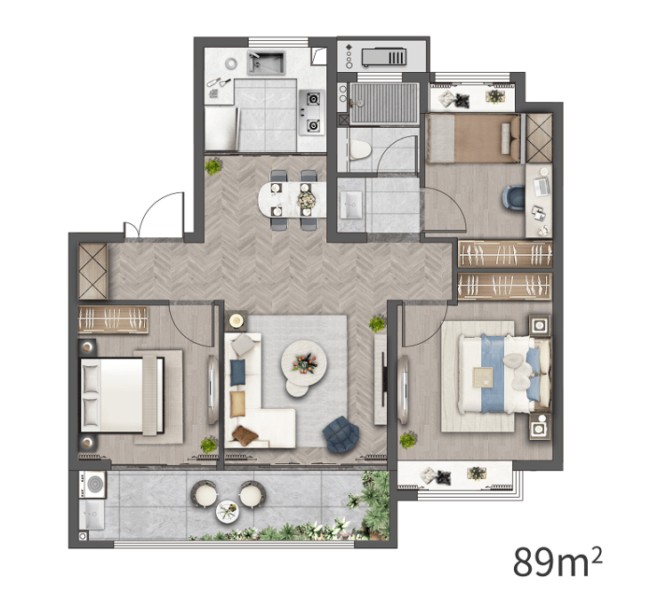 首开南岸潮鸣项目打造约89㎡与约113㎡, 89㎡户型设计中在既定的空间里通过科学的布局,使空间的可利用率极大提升,让每一处空间都能承载生活的内容,从而成功构建出带有LDKB一体化空间与无墙垛超大双阳台空间的三房两厅格局。