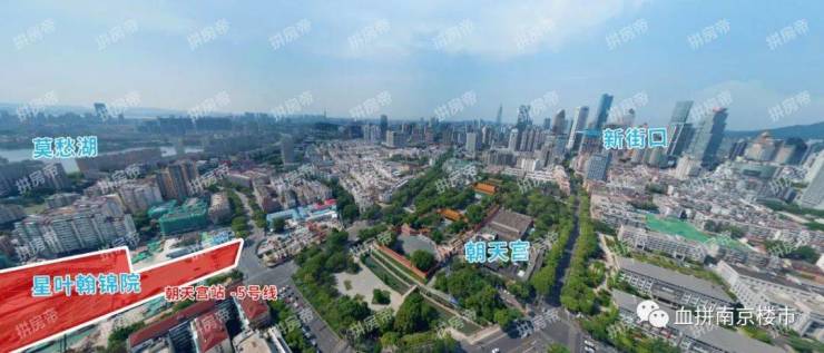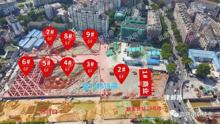 血拼哥来到位于朝天宫街道建邺路和莫愁路的交叉口的星叶翰锦院工地。从航拍中可以看到,翰锦院-朝天宫-新街口在一条动线上,距离十分接近。