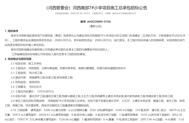 近日,南京公共资源交易中心公示了河西南7号小学的施工总承包招标公告,拟投资29892万元。