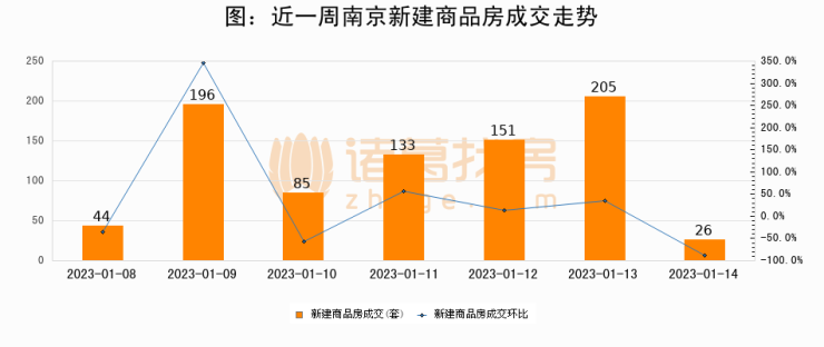 根据南京市住房保障和房产局数据显示,2023年01月14日南京新建商品房成交26套,较昨日减少179套,环比下降87.3%