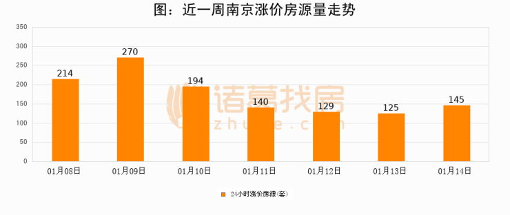 根据诸葛找房数据显示,南京24小时涨价房源量为145套,较01月13日增加20套,环比上涨16%。与此同时,涨价房源占比小幅扩大,业主信心有所提升。