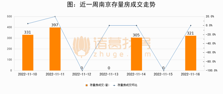 从存量房来看,2022年11月16日南京存量房单日成交321套,比昨日增加321套,环比上涨0%。从近一周存量房成交来看,南京存量房日均成交套数为193套,其中11月11日成交量最高为397套,11月16日单日成交321套,高于近一周平均水平66.3%。