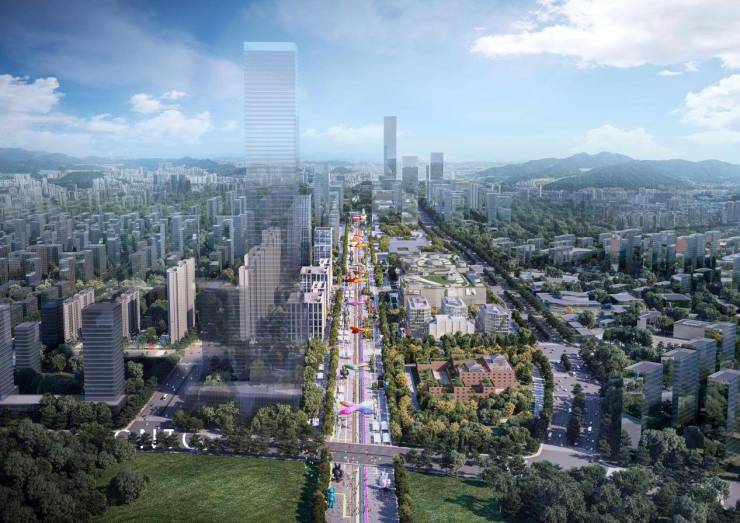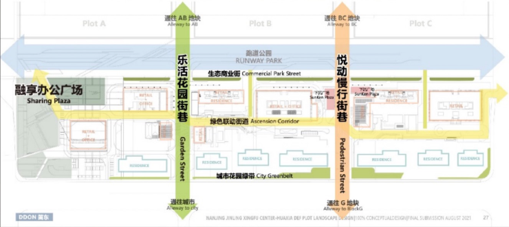 板块内唯一可以将市政绿化纳入小区景观中的项目两条特色街巷串联起南北7个分区,结合机场跑道公园区域级多功能公共空间的定位,两者之间形成开放互动的关系,共同构筑一个混合多元、开放包容的城市空间。