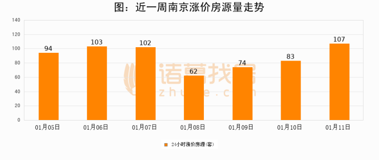 根据诸葛找房数据显示,南京24小时涨价房源量为107套,较01月10日增加24套,环比上涨28.9%。与此同时,涨价房源占比小幅扩大,业主信心有所提升。