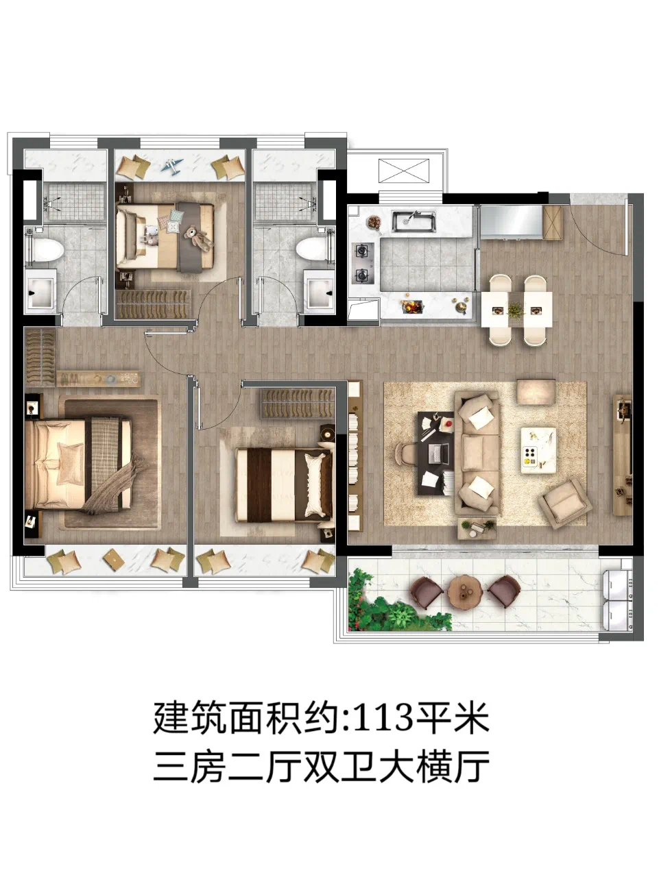 其中89、105㎡户型都是三房双阳台设计,105㎡户型主卧套房式设计,起居更为私密。而113㎡户型横厅设计,总的来说区域内横厅设计的户型还是较为稀缺的。