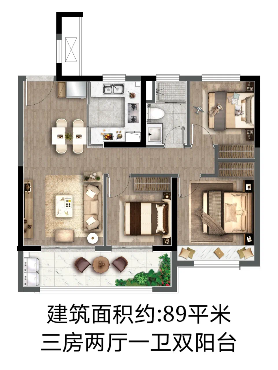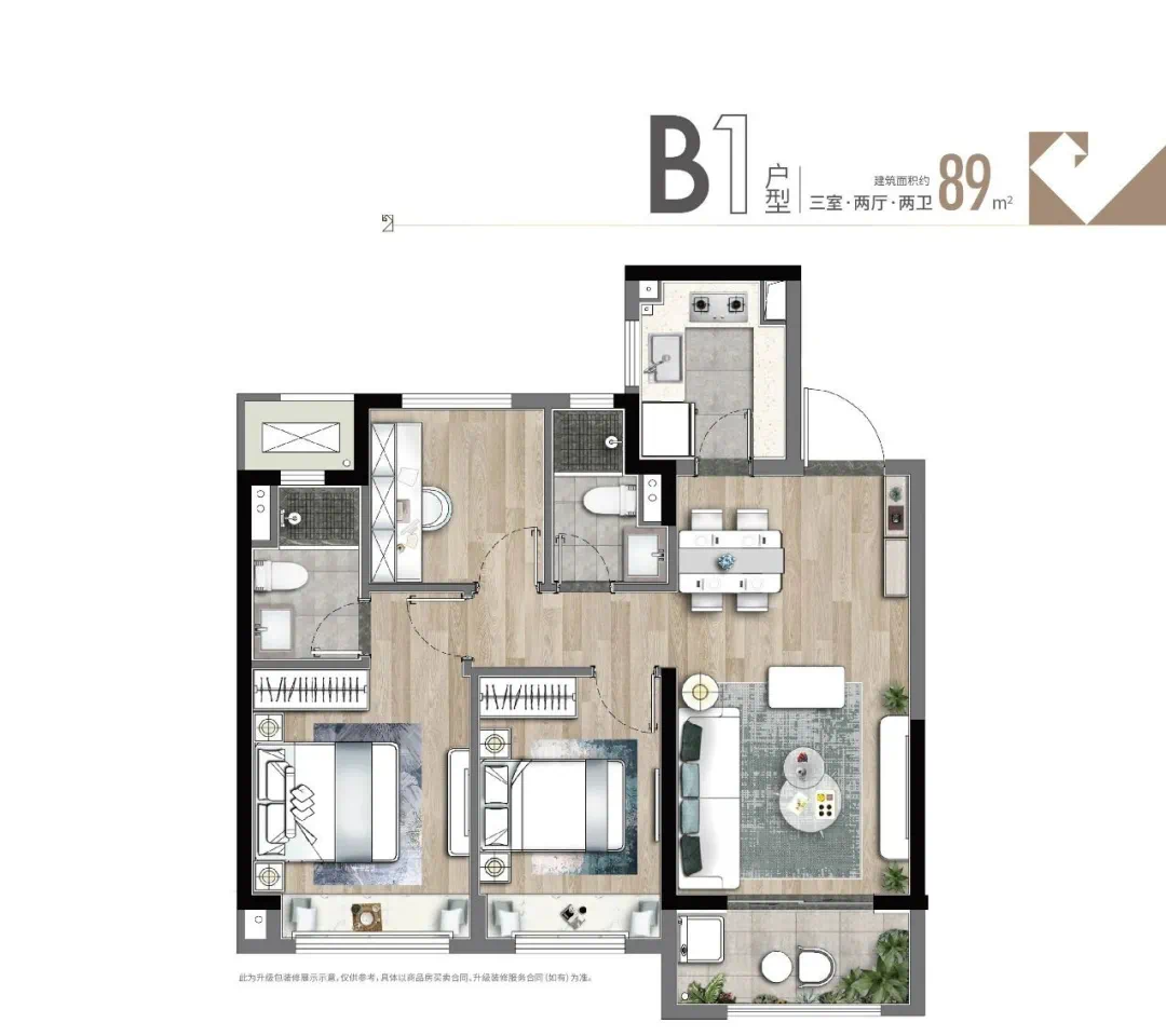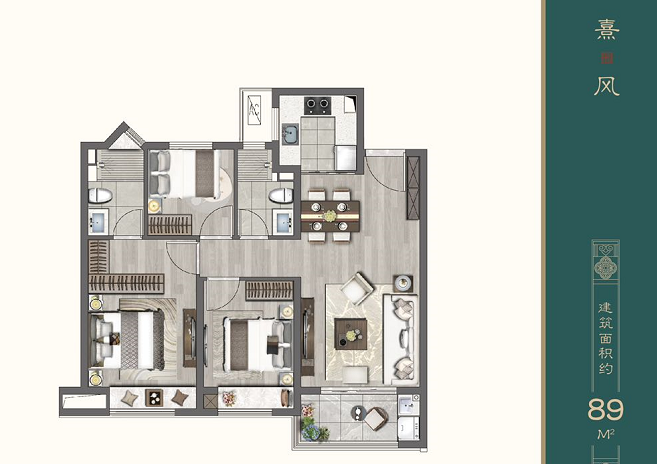 89㎡户型三室两厅两卫,市场上较为罕见。三开间朝南,通风采光都不错,套房式的主卧也使得起居更为私密,总体来说可以满足大多数年龄段家庭的需求。
