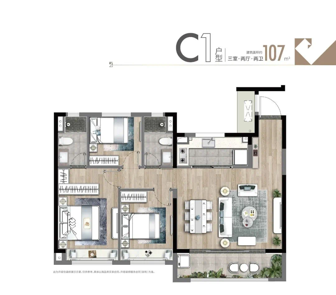 107㎡户型同为三室两厅两卫设计,值得一提的是,该户型与城南中心的正荣润棠府同款横厅设计,南向三开间搭配5.8米的横厅及阳台空间感极强,居住起来也更为宽敞。而107㎡户型也较为稀少。