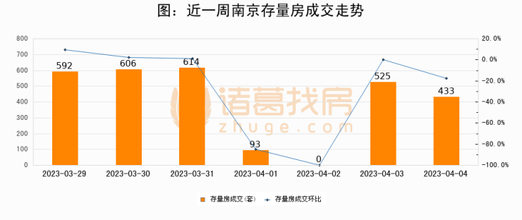 从存量房来看,2023年04月04日南京存量房单日成交433套,比昨日减少92套,环比下降17.5%。从近一周存量房成交来看,南京存量房日均成交套数为409套,04月04日单日成交433套,高于近一周平均水平5.9%。