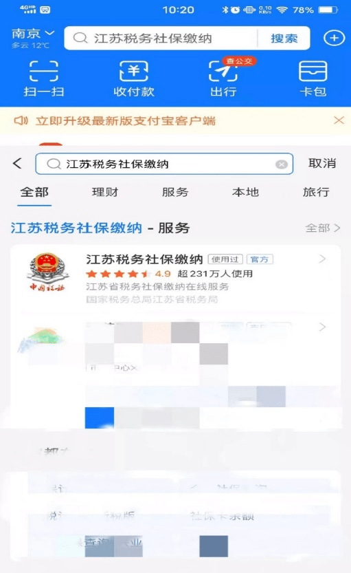 支付宝首页,搜索“江苏税务社保缴纳”,点击进入进行缴费操作。