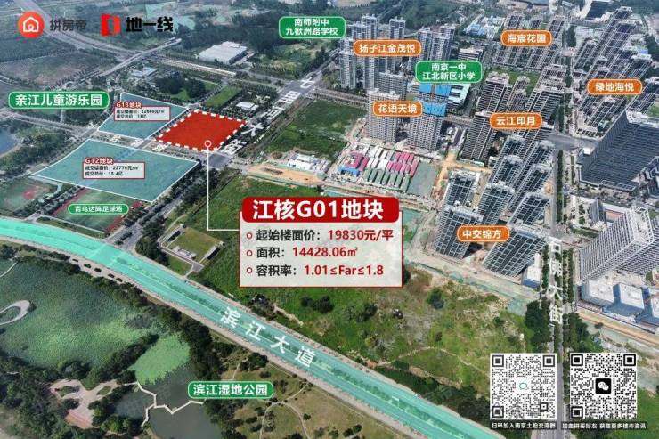 江核G01地块起拍楼面地价19830元/㎡,临近启龙亲子乐园、滨江风光带,景观资源不错,周边楼盘有花语天境、中交锦方等。