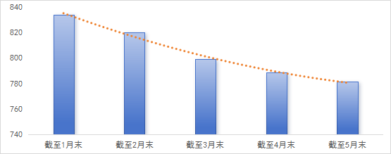 截至5月底,商品住宅已上市未销售面积781万 m 2,保持下降态势。