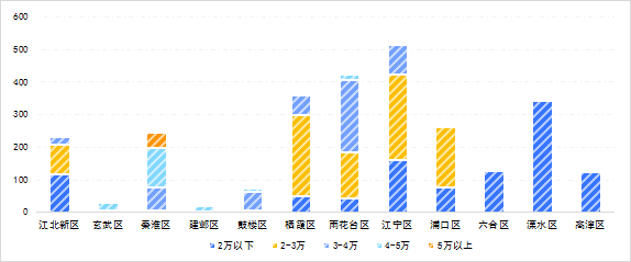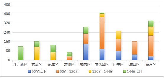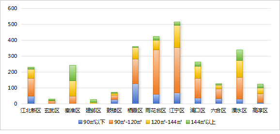 5月,商品住宅上市项目主要集中在栖霞区、雨花台区和高淳区,占全市上市总规模的 51%。商品住宅上市房源套均面积 127 m 2,主要面向各区的改善购房客群。其中,供应最多为 90 m 2 —144 m 2房源,共计1161套,主要分布在河西南片区、雨花两桥片区、栖霞迈皋桥片区、江宁东山片区及两湖片区、浦口城南中心、高淳开发区等;其次是90 m 2以下房源,供应409套,主要集中在栖霞兴智产城融合区、雨花台两桥片区、江宁淳化片区和正方新城片区。144 m 2以上房源共计367套,主要集中在玄武南片、江北新区核心区、秦淮月牙湖片区等。