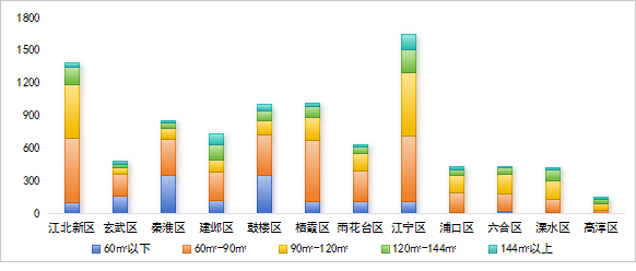 全市二手住宅成交房源中,60 m 2 —90 m 2 为主力面积段。江北新区、江宁区刚改客群购置需求也较为旺盛, 90 m 2 —120 m 2 户型产品同样受到市场青睐。