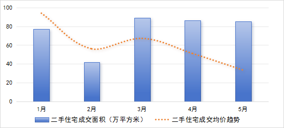 5月,全市二手房成交91.57万 m 2,其中二手住宅交易9192套(日均296套),成交面积85.22万 m 2,环比基本持平。成交价格呈现波动下降。
