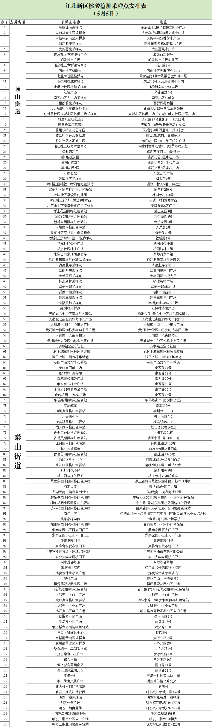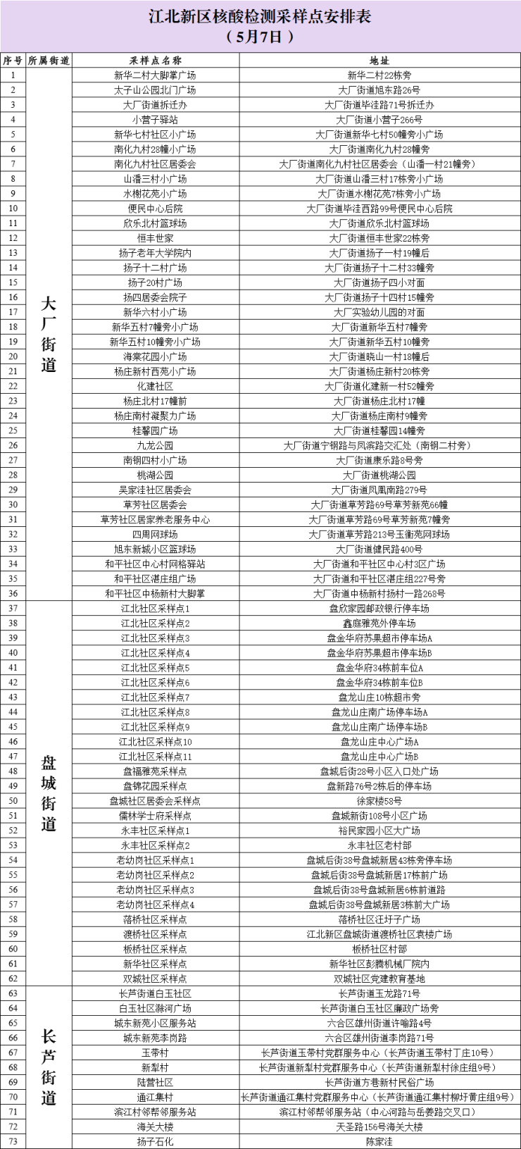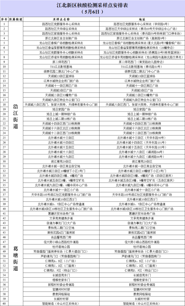 附表:江北新区核酸检测采样点安排表(5月5日-7日)