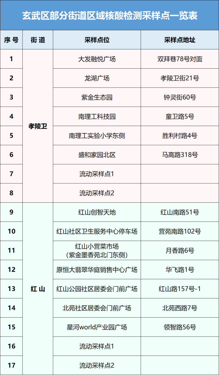 附表:孝陵卫街道和红山街道核酸检测采样点一览表