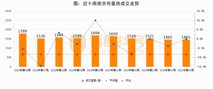 存量房方面,第35周南京存量房成交1465套,较上周持平。从近十周成交走势来看,周均成交套数为1575套,本周低于平均水平7%。