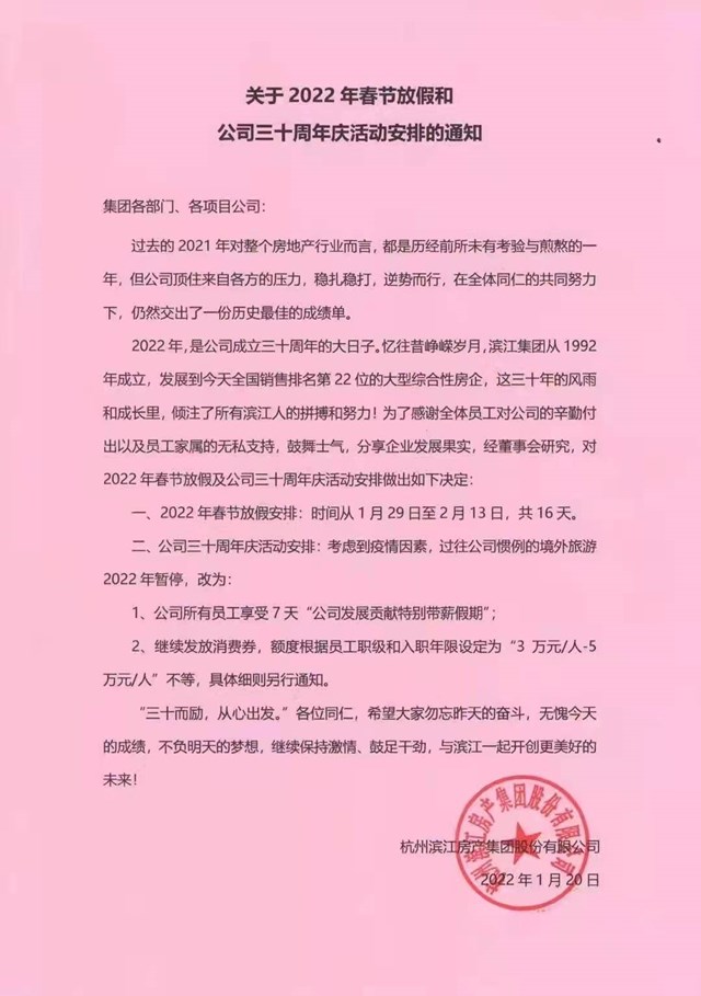 1月20日上午一大早,房企滨江集团(002244.SZ)的员工告诉记者,他们又收到了激动人心的通知:春节休假16天,由于疫情原因境外旅游暂停,改为所有员工享受7天“公司发展贡献特别带薪假期”,并发放消费券,根据员工职级和入职年限设定为“3万元/人-5万元/人”不等。
