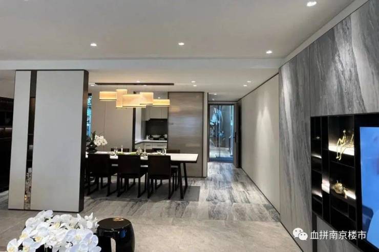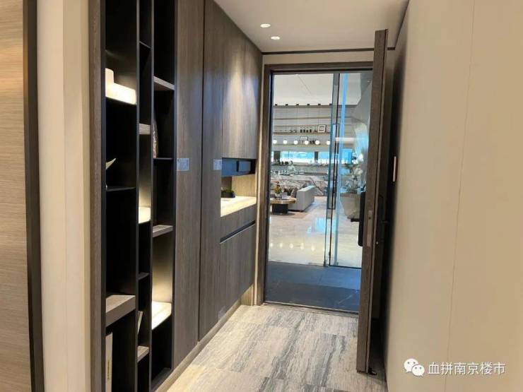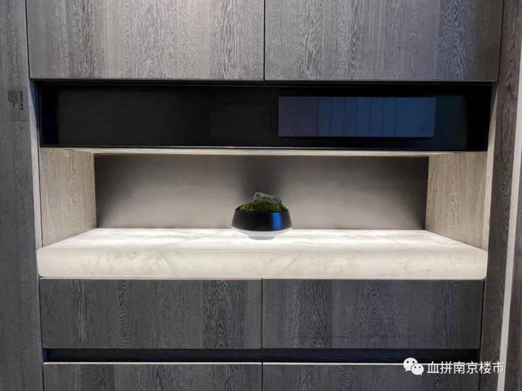 和入户大门一样,入户玄关同样采用鸡翅木纹理、竹林灰色调,此外,台面上运用了透光云石,搭配琴键式开关面板,在南京住宅里少见,一般用于五星级酒店的装饰。