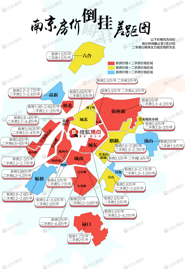 目前南京还有哪些板块存在倒挂,哪些板块的倒挂已经逐渐拉平,哪些板块的新房价甚至已经超过了二手房价?我们在地图上以不同颜色来区分这三类情况,为大家买房提供参考。