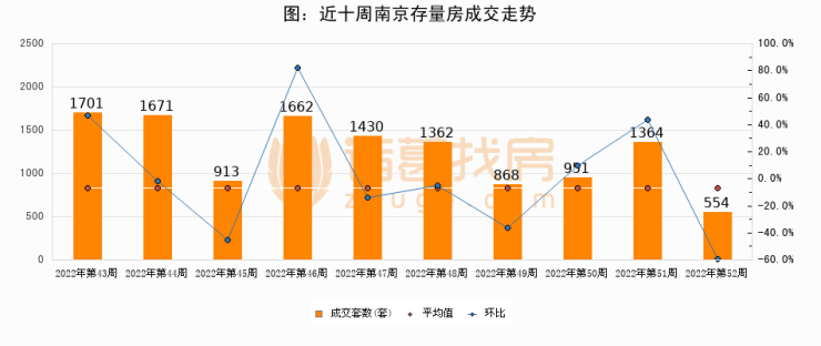 存量房方面,第52周南京存量房成交554套,较上周减少810套,环比下降59.4%。从近十周成交走势来看,周均成交套数为1247套,本周低于平均水平55.6%。