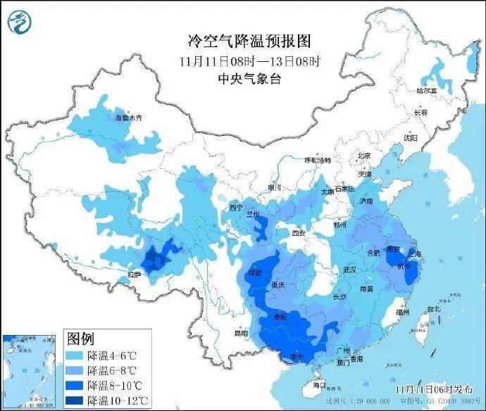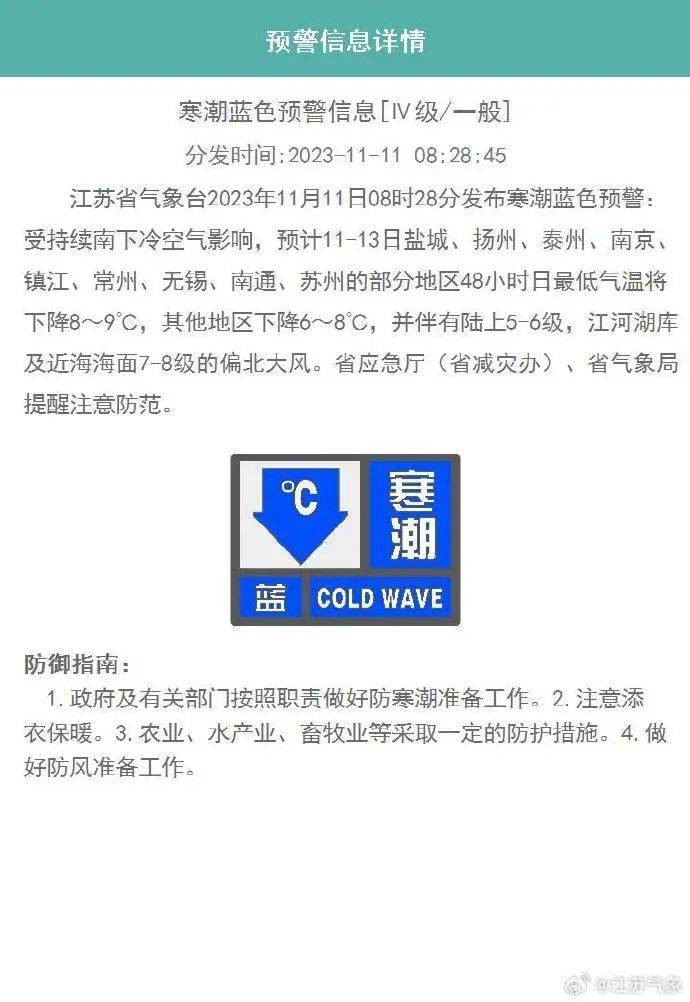 受持续南下冷空气影响,预计11-13日盐城、扬州、泰州、南京、镇江、常州、无锡、南通、苏州的部分地区48小时日最低气温将下降8~9℃。