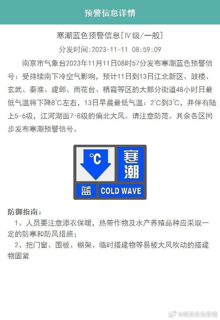 受持续南下冷空气影响,预计11日到13日江北新区、鼓楼、玄武、秦淮、建邺、雨花台、栖霞等区的大部分街道48小时日最低气温将下降8℃左右,13日早晨最低气温:2℃到3℃,并伴有陆上5-6级,江河湖面7-8级的偏北大风。请注意防范。其余各区同步发布寒潮预警信号。