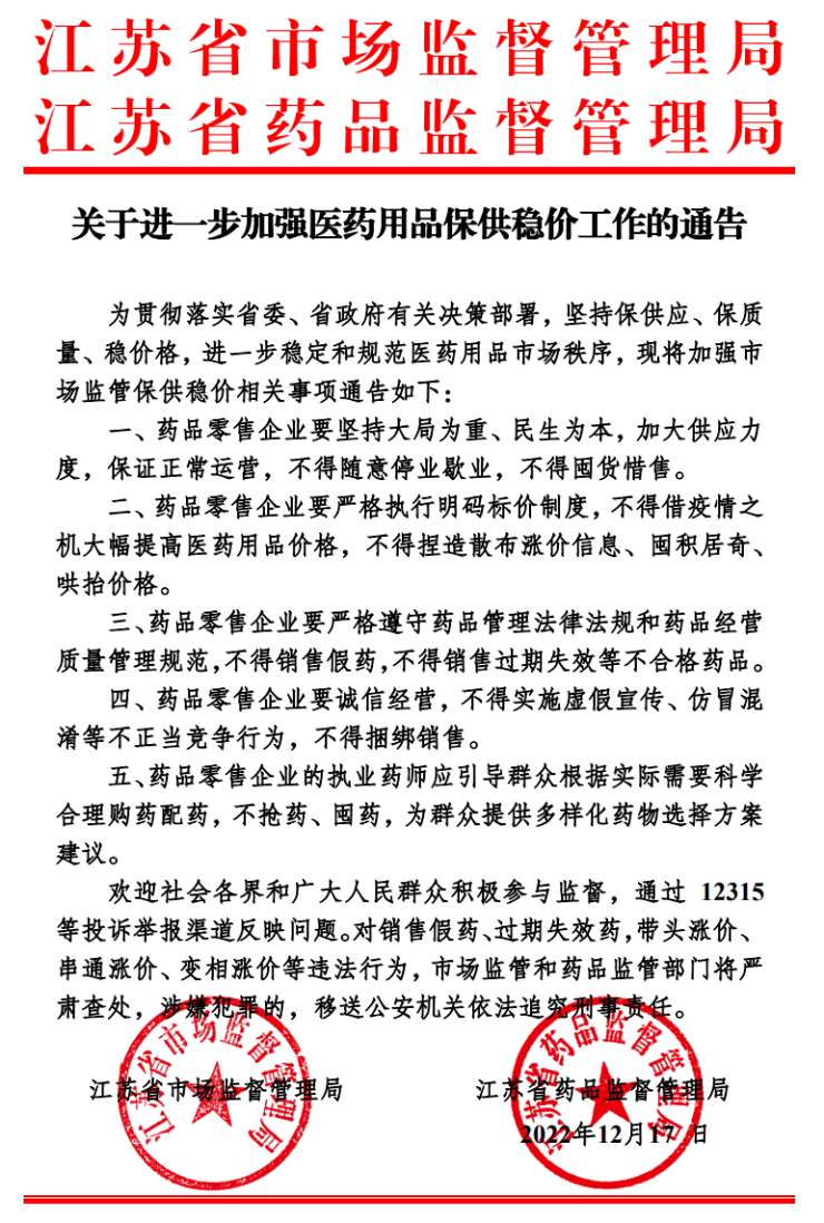 12月17日,江苏省市场监督管理局、江苏省药品监督管理局联合发布《关于进一步加强医药用品保供稳价工作的通告》。